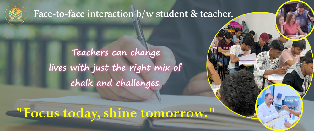 Students and teachers interact face-to-face, engaging in lectures, discussions, and practical activities.